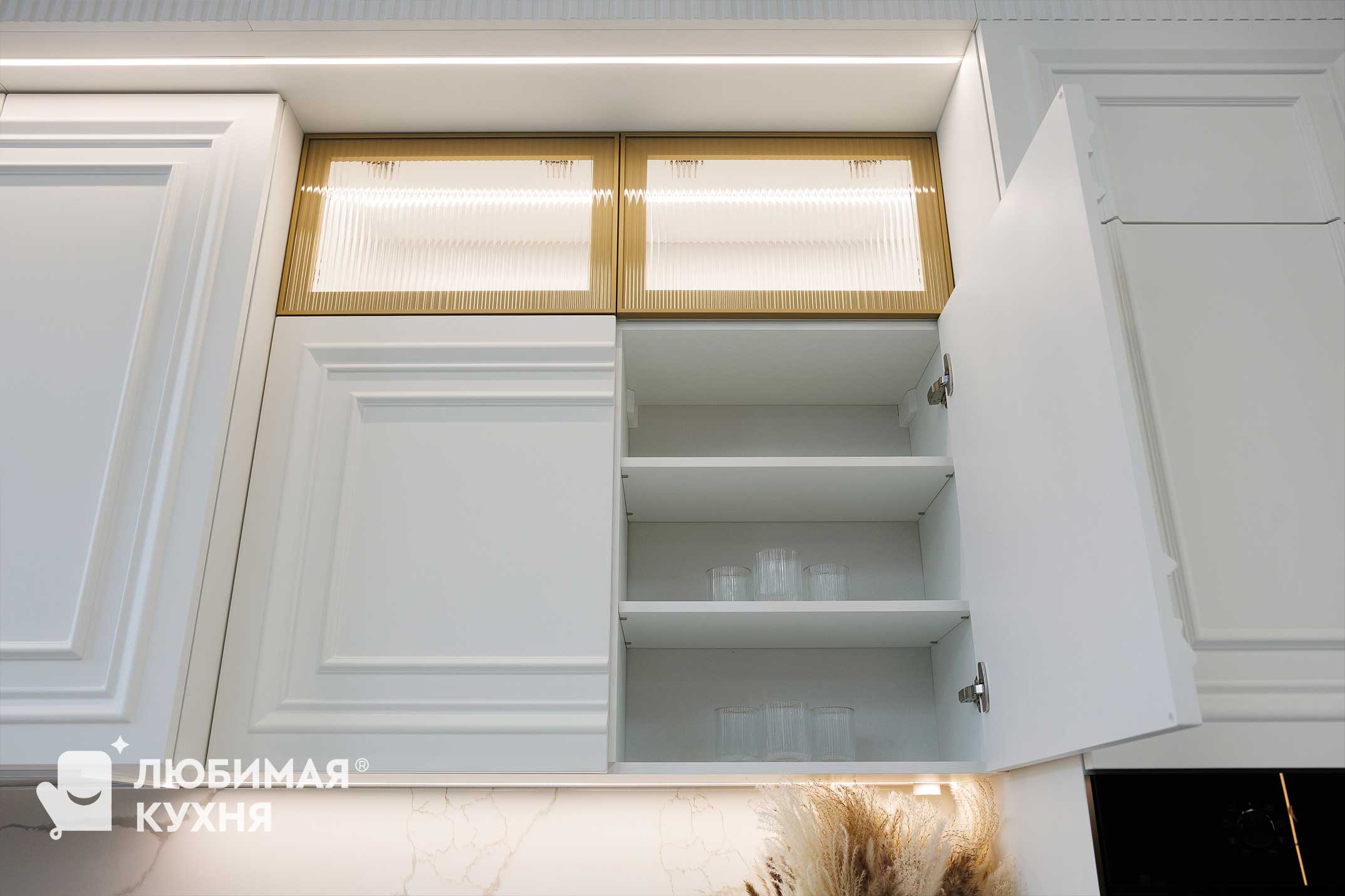 Светлые фасады с классической фрезеровкой, доходящими до потолка, визуально увеличивают высоту помещения и создают ощущение цельного архитектурного объёма. Витринные вставки с подсветкой добавляют лёгкости и декоративности. Карниз и вертикальные панели подчёркивают классический характер композиции.