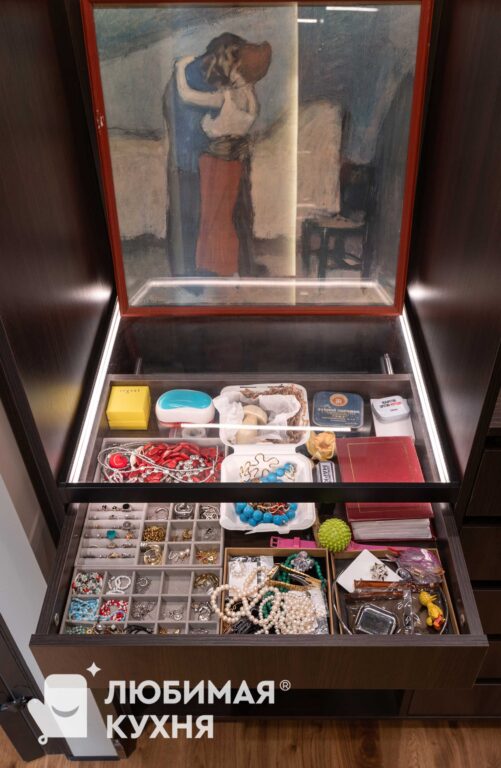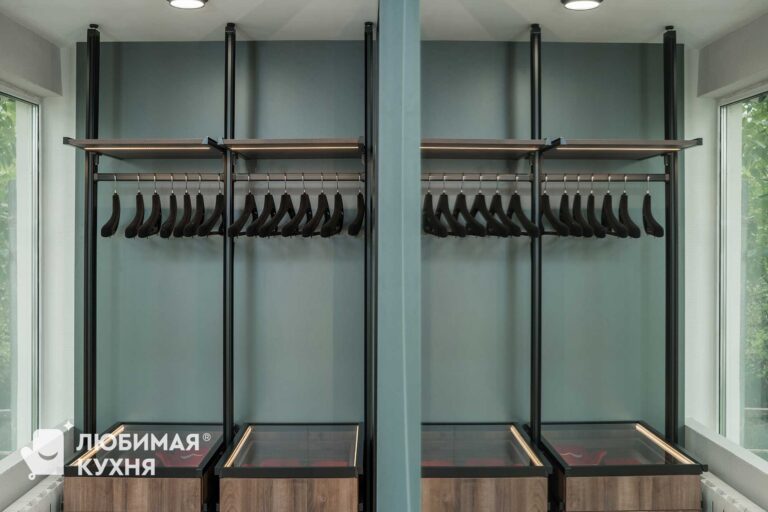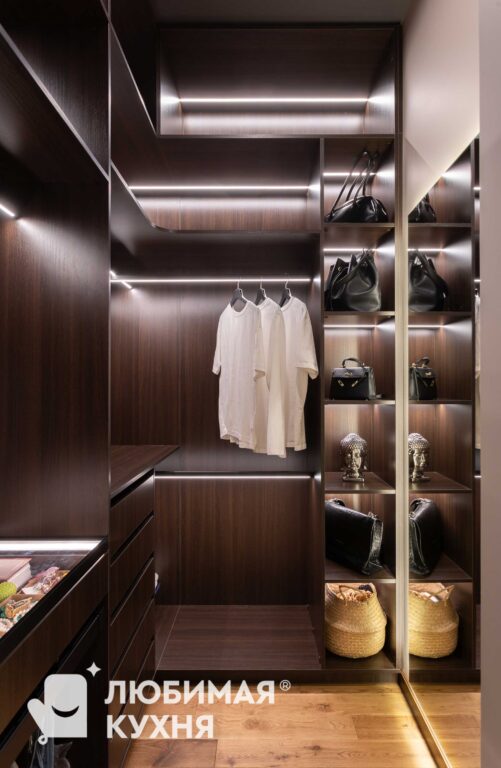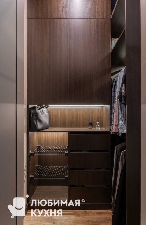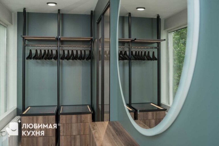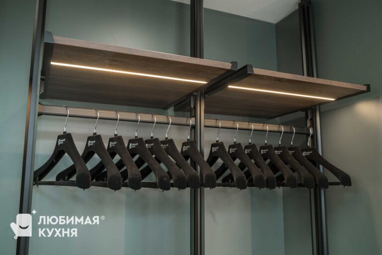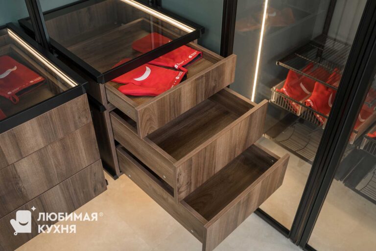 В гардеробной чаще всего применяются стеллажи, комоды, секции с ящиками, вешалки, пеналы, а также выдвижные корзины для обуви и текстиля. Для удобства можно установить полки с разной глубиной и шириной, чтобы организовать компактные системы хранения.