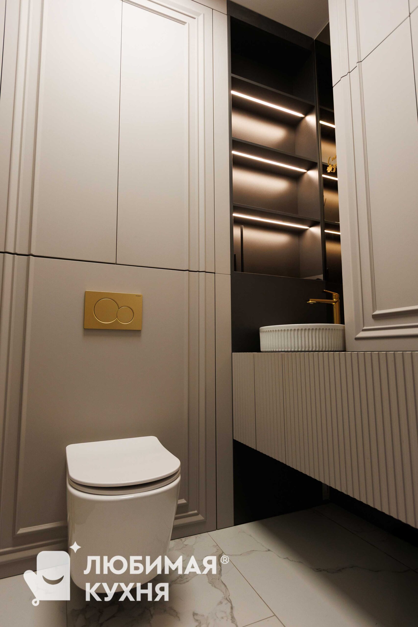 Элегантная мебель для санузла в неоклассическом стиле с фасадами мягкого кремового оттенка. Встроенный шкаф-пенал с фрезерованными фасадами скрывает инсталляцию и обеспечивает вместительное хранение. Контрастная тумба под раковину с рифленым фасадом и столешницей из чёрного мрамора с белыми прожилками создаёт изысканный акцент. Настенные полки с тёплой подсветкой за тонированным стеклом добавляют глубину пространству. Золотистая фурнитура, смеситель и аксессуары подчёркивают премиальный характер интерьера.